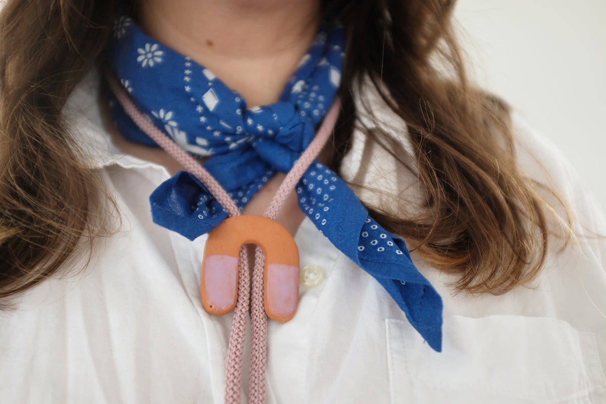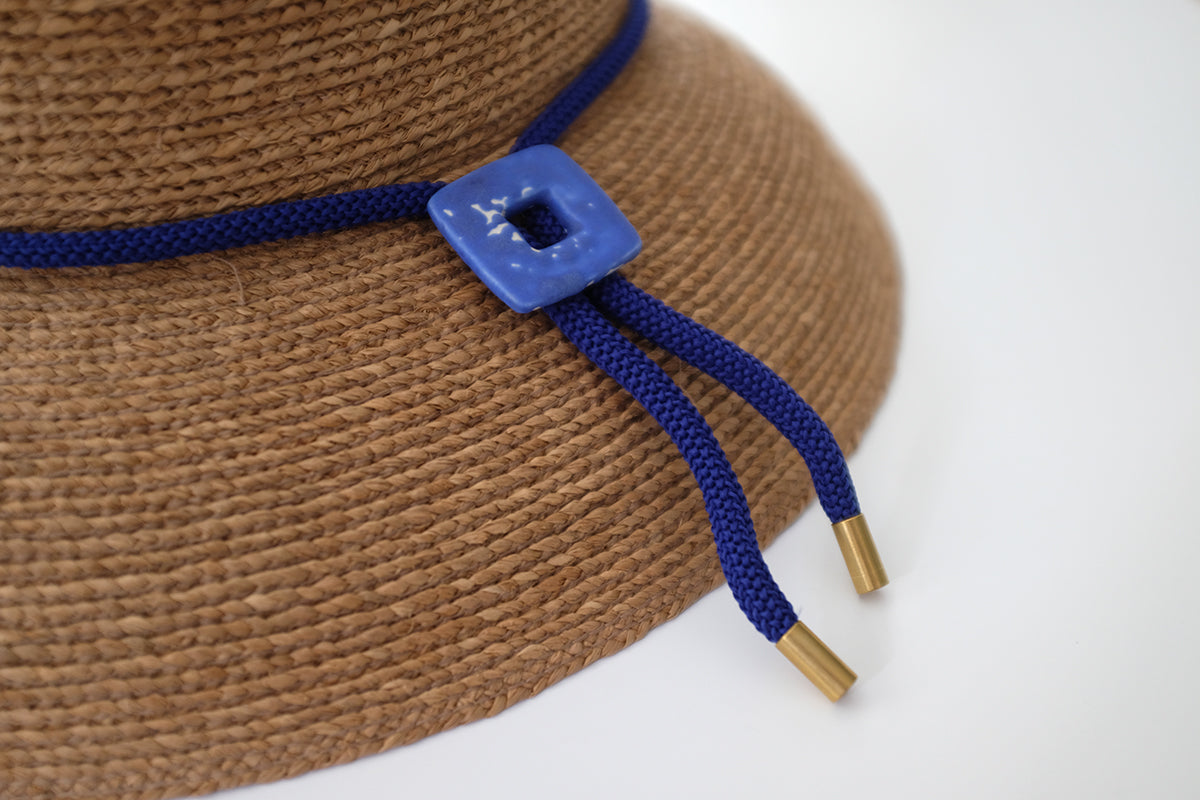 One of a kind ceramic bolo by Acorn + Archer. Can be worn as a necklace or paired with a hat. Cobalt mod square, on a cobalt band with brass tips.